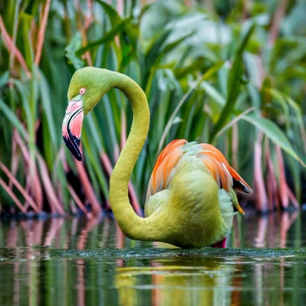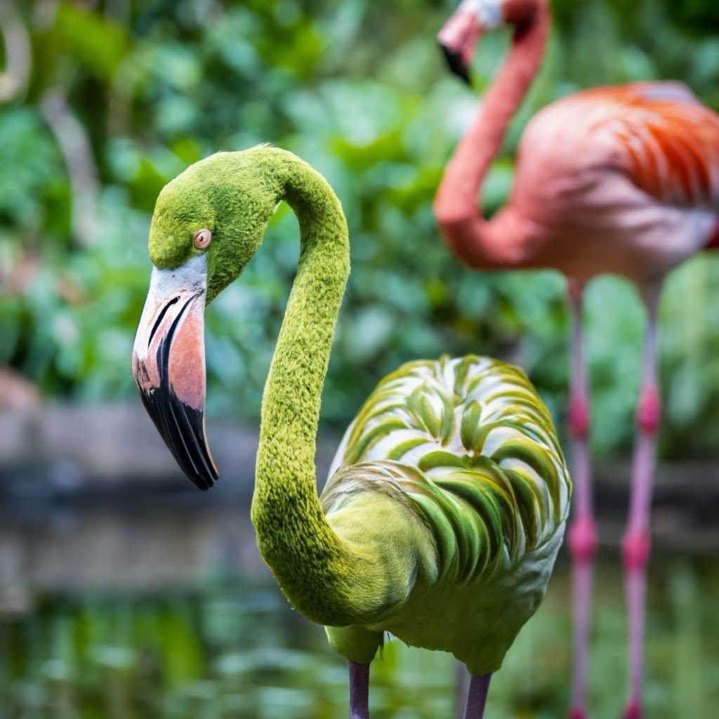 Dass die Farbe der Federn von Flamingos durch die Ernährung mit Krebsen hervorgerufen wird, ist ja weithin bekannt. Eine Forschergruppe in Doveland (Wisconsin) hat nun in einem Experiment einige Flamingos vorwiegend mit Spinat und Brokkoli gefüttert, das Ergebnis ist verblüffend.