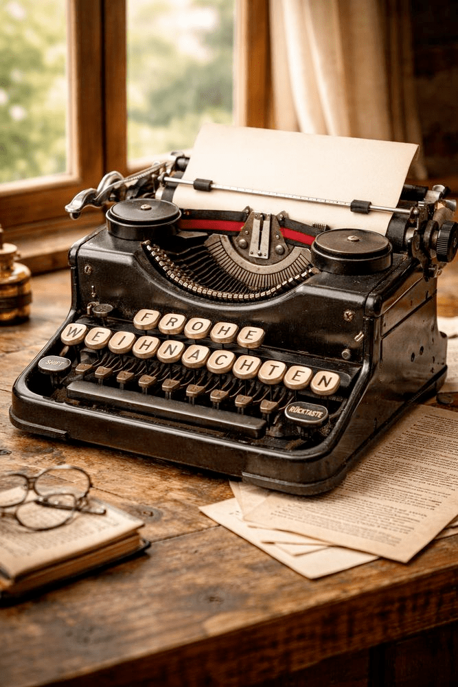 Saisonbedingte Floskeln und Grüße haben ja zurzeit Hochkonjunktur. Ich hab mich da nicht ausgenommen und bin da ein wenig kryptisch an die Sache herangegangen. Die KI hat mir da flott ein Bildchen gezimmert, ohne Christkinder, Tannen, Keksen oder heiligen Kläusen. Und dann kribbelte es auch schon in meiner weihnachtlichen und auch weinnachtlichen Denkstube. Was könnte man mit dieser schönen Schreibmaschine wohl so an Geschichten schreiben? Gleich mal die KI nach Wörtern befragen, die da aus dem alten Vehikel purzeln könnten – aber wenn die mir „Weide“ oder „hetzen“ vorschlägt, fühlt man sich als Schreiberling ein wenig wenig ernst genommen. Denn „D“ oder „Z“ hat die weihnachtliche Schreibmaschine nämlich nicht im Angebot. Auch kein „G“ oder „B“…