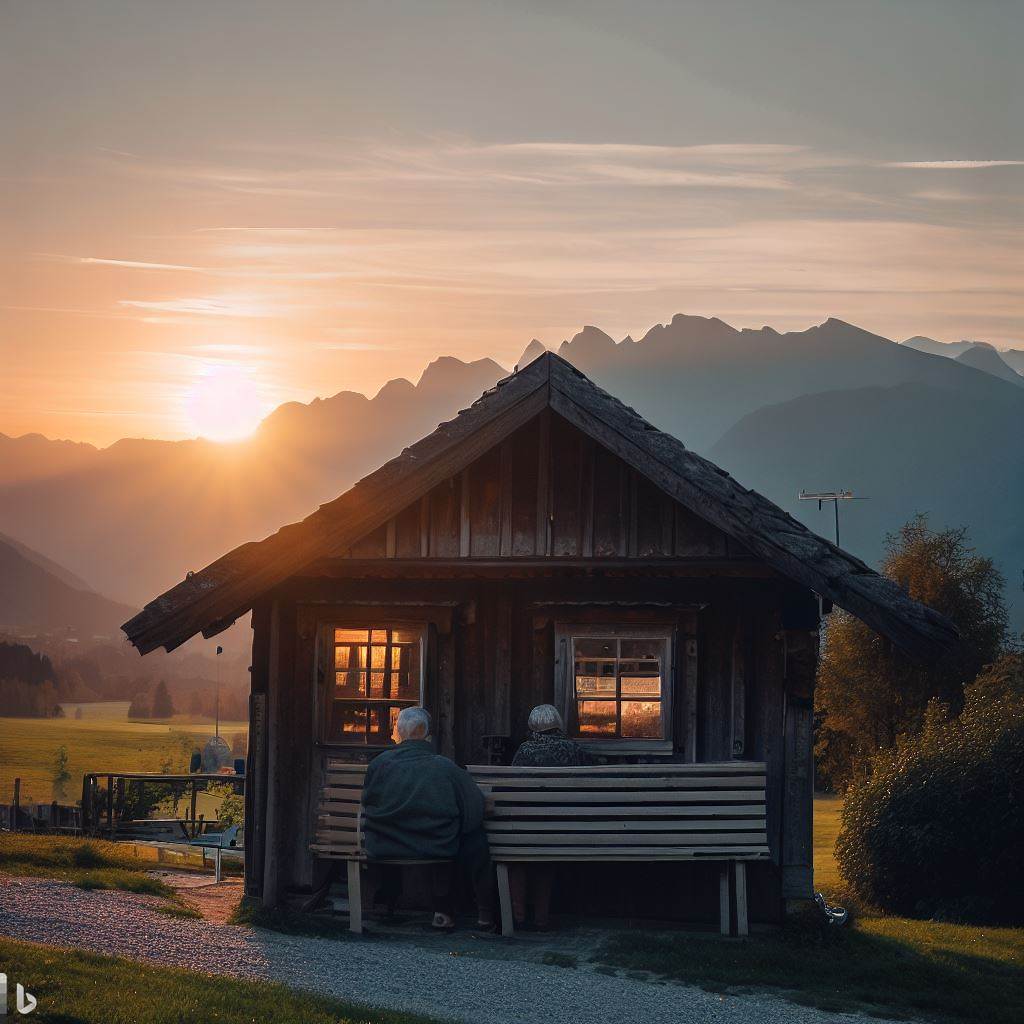 „a tiny wooden house in austria, sundown, mountains in background, a old couple sitting on a bench, watching the sun“